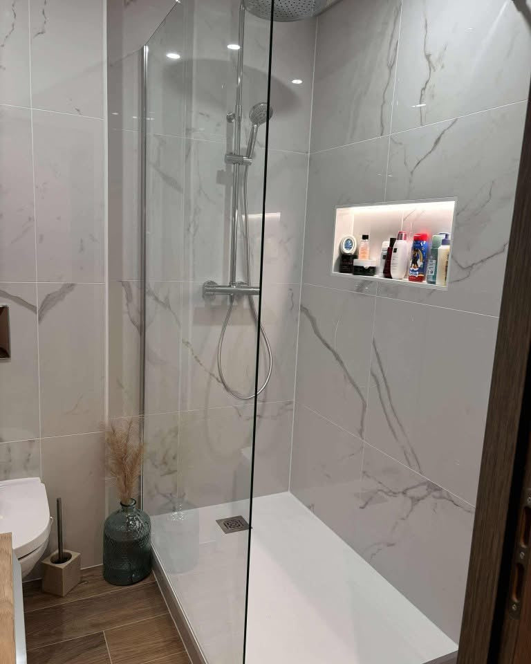 Douche italienne, carrelage, plomberie, électricité et finitions haut de gamme.